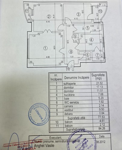 Apartamentul are o suprafata utila de 77,53 mp si doua balcoane in suprafata totala de 6,73 mp, rezultand o suprafata totala de 84, 26 mp.