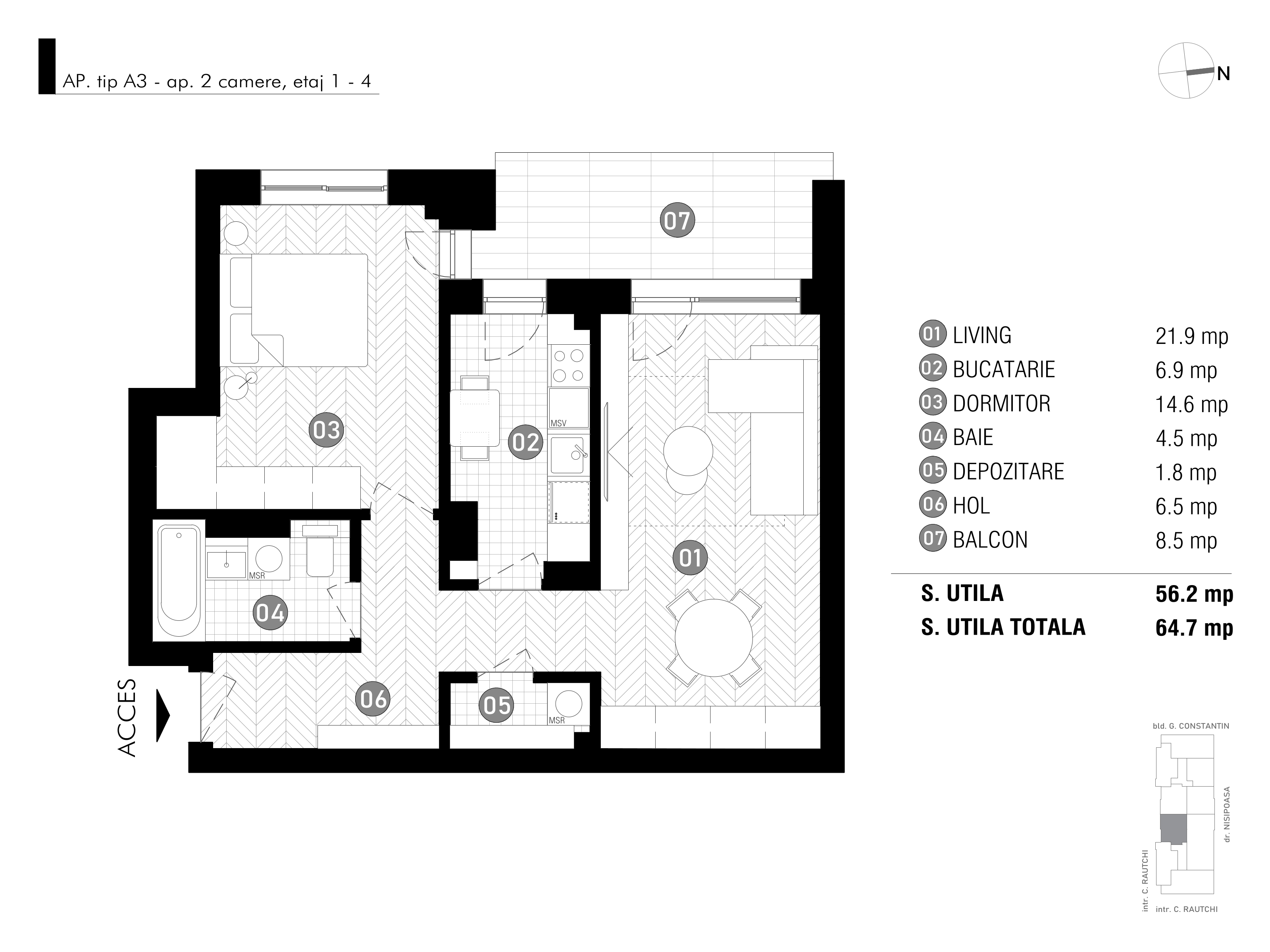 calculeaza distantaAviatiei, Henri Coanda, Desfasurat pe o suprafata totala utila de 64,7 mp, apartamentul este inteligent compartimentat, lasand lumina naturala sa puna in valoare mai mult spatiul locuibil.