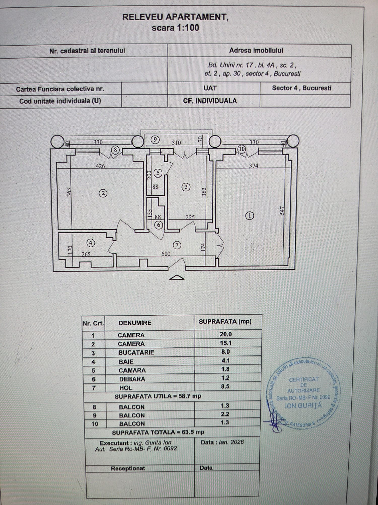 in plus, fiecare camera si bucataria au cate un balcon, propriu, de 1,5-2 m.p. ( a se vedea planul anexat). Total suprafata 66 m.p. ( 63, 5 m.p. - conf. Releveu ian. 2026, anexat).