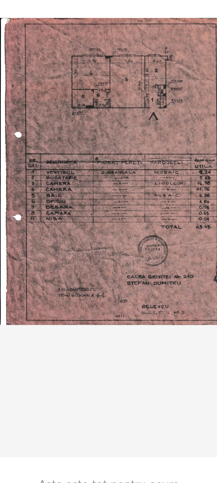 Grivita Fara comisioane pe Grivita la 2 minute de metrou si RATB, diverse marketuri, scoala, gradinita, policlinica, parc, etc., am placerea sa va prezint un apartament semidecomandat la etajul 2 in bloc reabilitat- termic de 7 etaje. Apartamentul necesita renovare. Dispune de termopane. Se accepta si credit. Pentru mai multe detalii si vizionare, ne putem auzi la telefon in fiecare zi, de luni pana duminica intre orele 09 - 21.