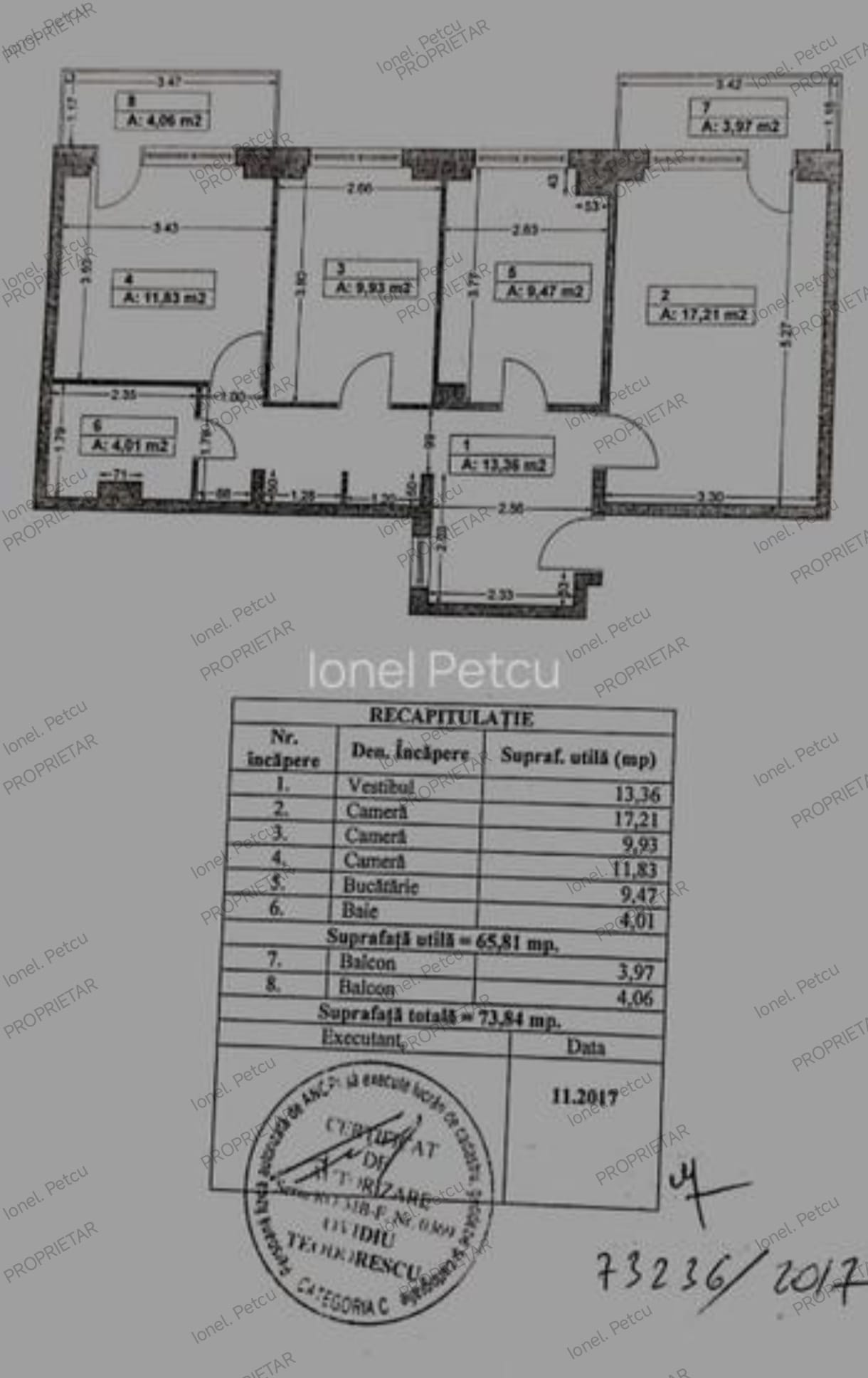confort1, decomandat, cu o suprafata utila totala de aproximativ 74mp. situat la etajul 8, cu orientare spre Sud-Est, avand doua balcoane inchise cu tamplarie PVC geam dublu termopan, la fel si ferestrele din intreaga locuinta.