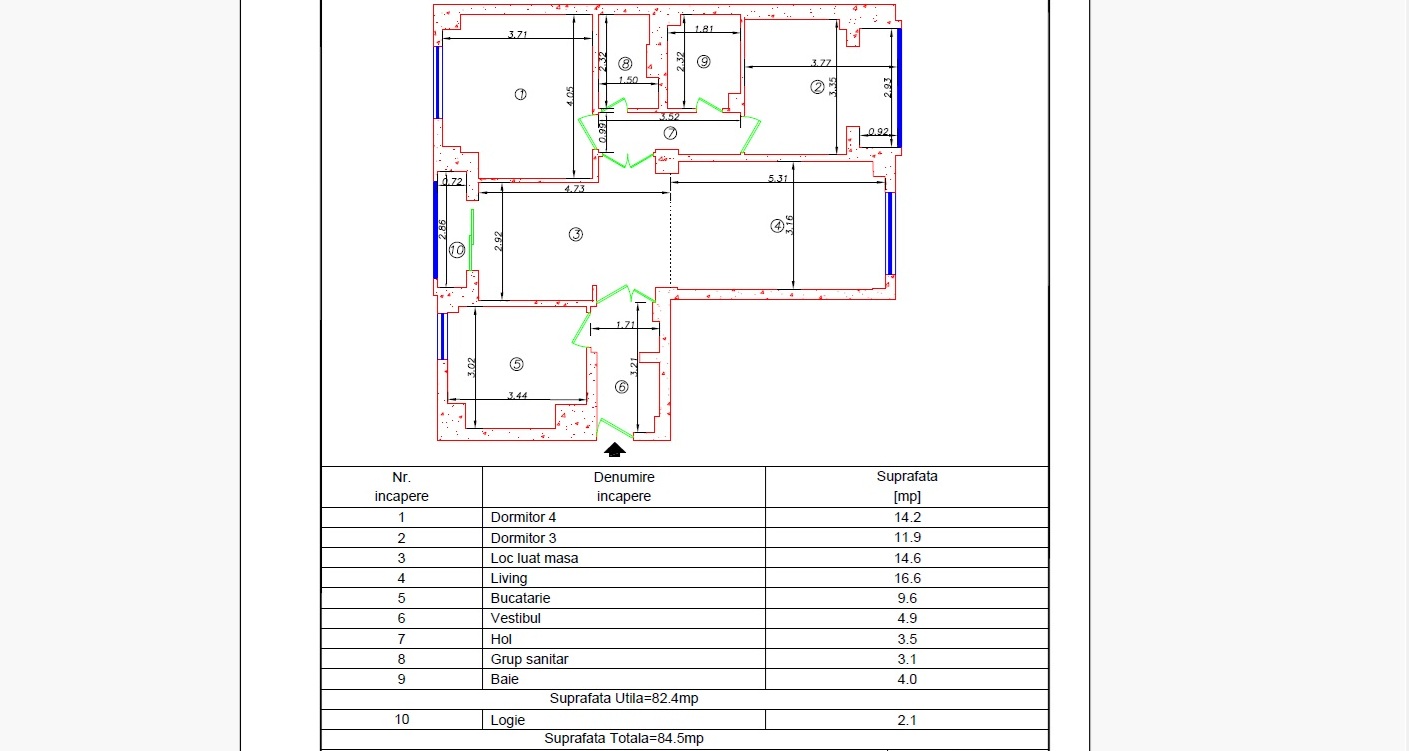 Apartamentul a fost modificat cu proiect si autorizatie, avand acum un living (camera de zi + loc de luat masa) foarte spatios - 31 mp si luminos, cu geamuri pe ambele parti ale blocului, bucataria - 10 mp, un dormitor matrimonial cu dressing - 14 mp si un dormitor mic cu logia inclusa in suprafata utila - 12 mp. Baile au fost si ele modificate, avand acum amandoua cada. Vezi schita atasata.