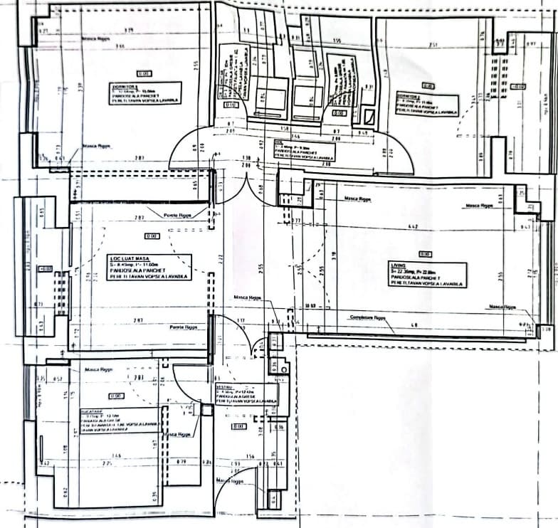 Apartamentul a fost modificat cu proiect si autorizatie, avand acum un living (camera de zi + loc de luat masa) foarte spatios (aproape 40 mp) si luminos, cu geamuri pe ambele parti ale blocului, bucataria - peste 10 mp, un dormitor matrimonial cu dressing si un dormitor mic cu logia inclusa in suprafata utila. Vezi schita atasata.