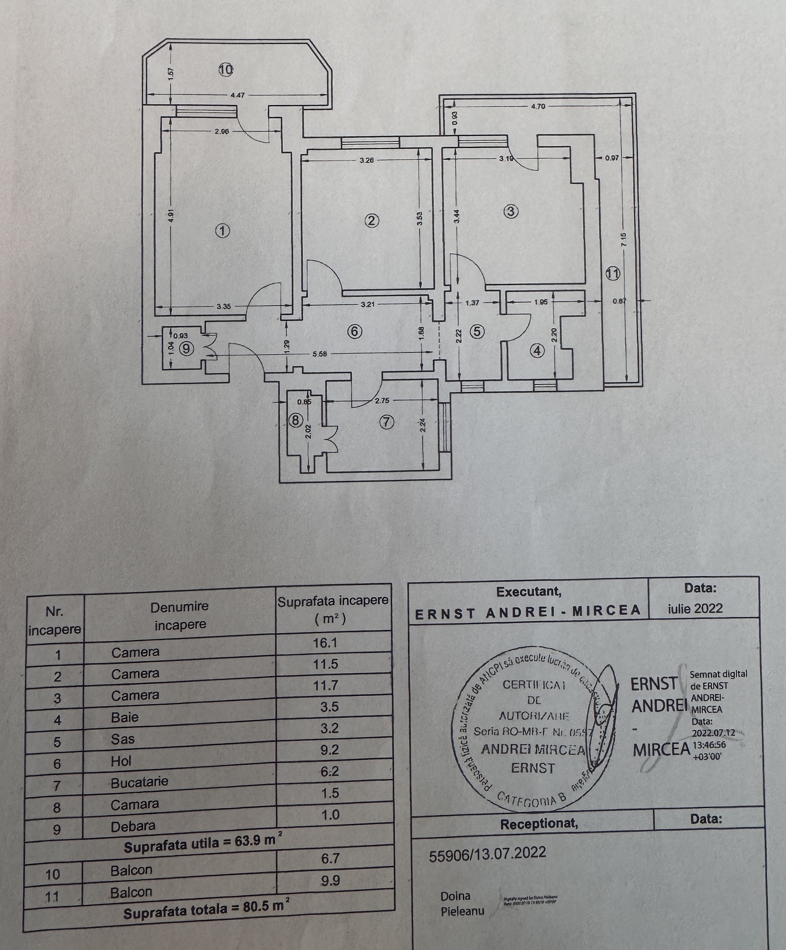 Suprafata utila a apartamentului este de 80.5 mp cu tot cu balcoane.
