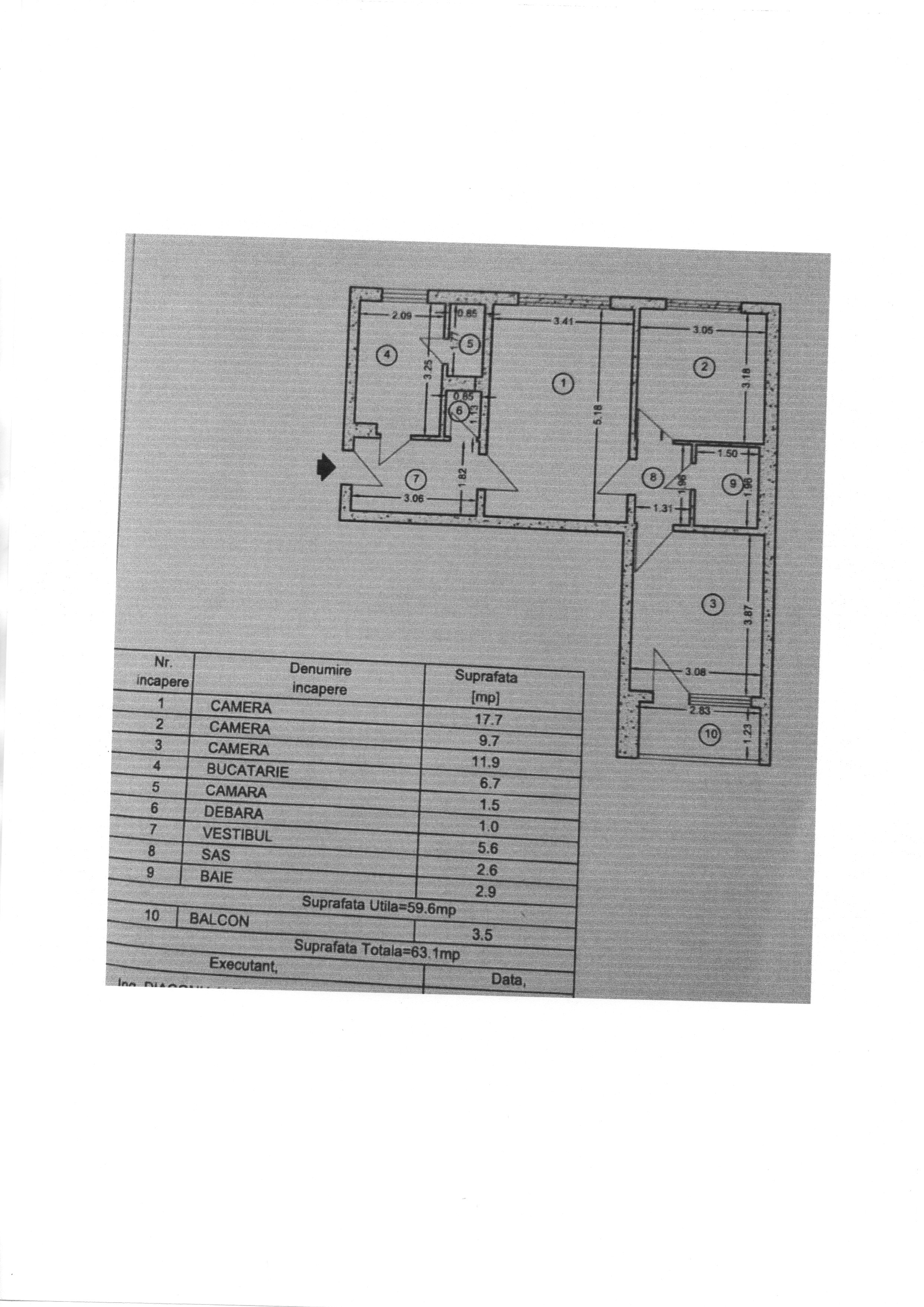 Apartament decomandat, etaj 2/4, pozitionat pe mijloc, cu vedere mixta, pe Sud fiind dormitorul mic, sufrageria si bucataria, iar pe Nord dormitorul mare cu balcon, doar ferestre termopan si usa metalica, fara alte imbunatatiri, cu suprafata totala de 63,1 mp si suprafata utila 59,6 mp.