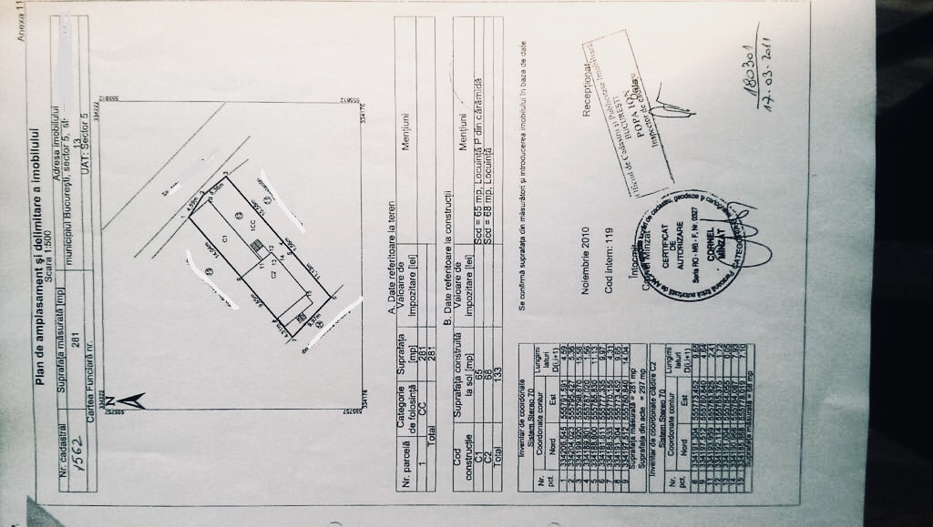 Terenul are deschidere 10 m si lungime 30 m. Cele doua corpuri de casa au amprenta la sol de 136 mp din totalul de 286 mp masurati sau 300 mp din acte, reprezentand 45% POT si curte libera 150 mp.