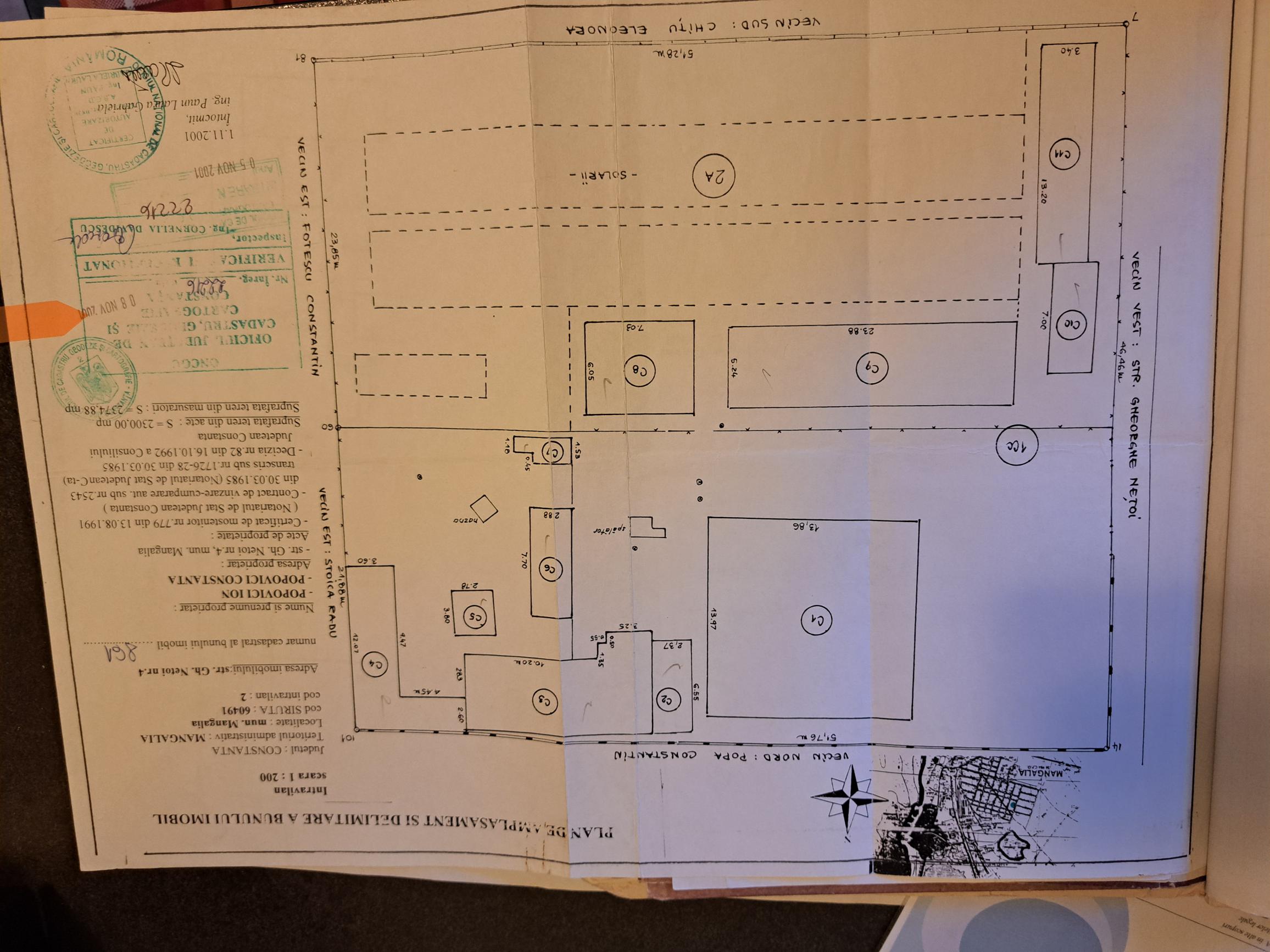 calculeaza distantaMangalia Proprietatea se afla in Mangalia, are cadastru, intabulare, expertiza tehnica, impozite platite la zi, acoperis tigla, utilitati: fose, apa si lumina pe proprietate, iar gazul este la poarta. Terenul are 2300mp in acte si 2374.88mp la ultima masuratoare reala, cand s-a facut succesiunea. Casa mare are 159mp utili la sol, iar la etaj 163mp utili are 9 camere, iar la subsol sunt 2 camere in suprafata de 25.86mp, (beci, crama, buncar). Pe langa casa principala exista si o casa de oaspeti cu un subsol de 4.1mp ideal functiune camera tehnica, sunt cateva dependinte, magazii, sere. Exista placa de beton intre etajul 1 si pod. Suprafata proprietatii permite amenajare gradina, foisor, piscina, se pot face multe locuri de parcare, lotul avand o deschidere la strada de 46.46ml ×51.5ml. Facand PUZ, lotul poate fi utilizat pentra a dezvolta locuinte individuale (bloc de apartamente) sau supermarket gen Penny, Lidl. Zona linistita, la distanta mica de sala de sport, scoala, gradinita, la 50m pe strada principala circula mijloc de transport in comun. Cautam pe cineva cu viziune si bani, care sa transforme acest loc intr-o locatie minunata!