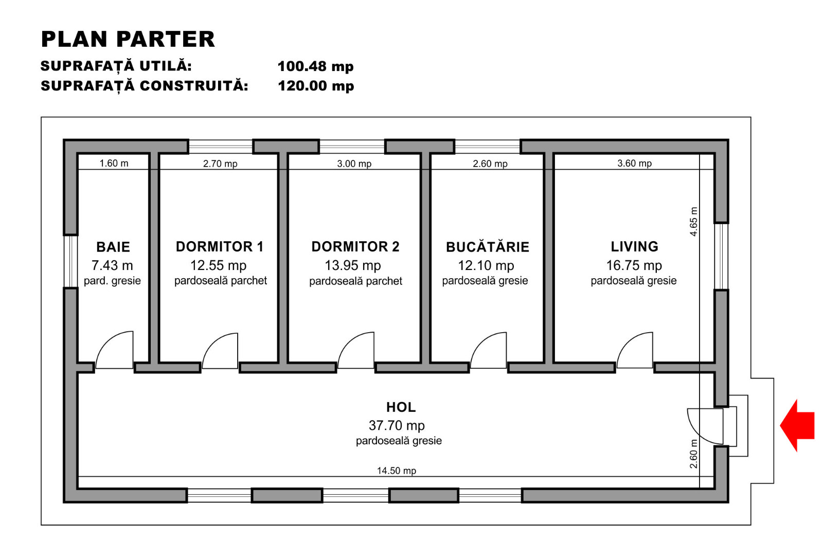 Casa este compusa din 3 camere, baie, bucatarie si un hol foarte generos, din care se face accesul catre toate camerele.