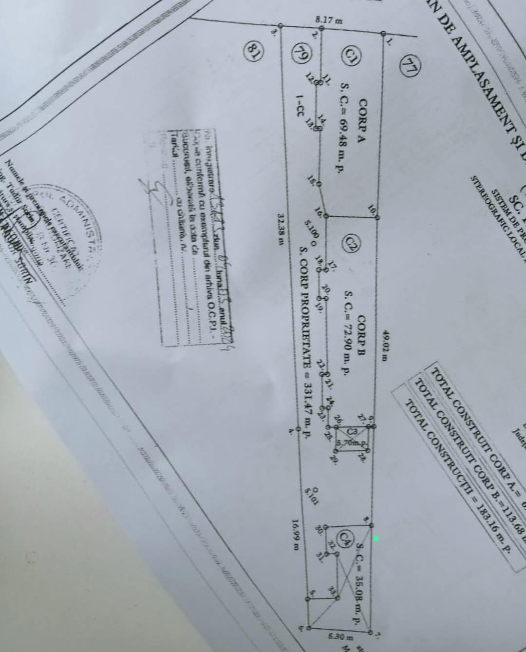 Se vinde corpul B si tot terenul . Corpul A nu se vinde, aici este un laborator tehnica dentara cu program L-V ce apartine proprietarului corpA .Acesta are un drept de trece de la poarta pana la prima usa (3,30 max )