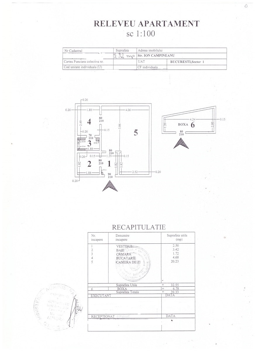 Garsoniera se afla la etajul 6/7 (bloc S+P+7E) si are o suprafata utila de 32,55 mp, la care se adauga o boxa la subsol de 6,78 mp.
