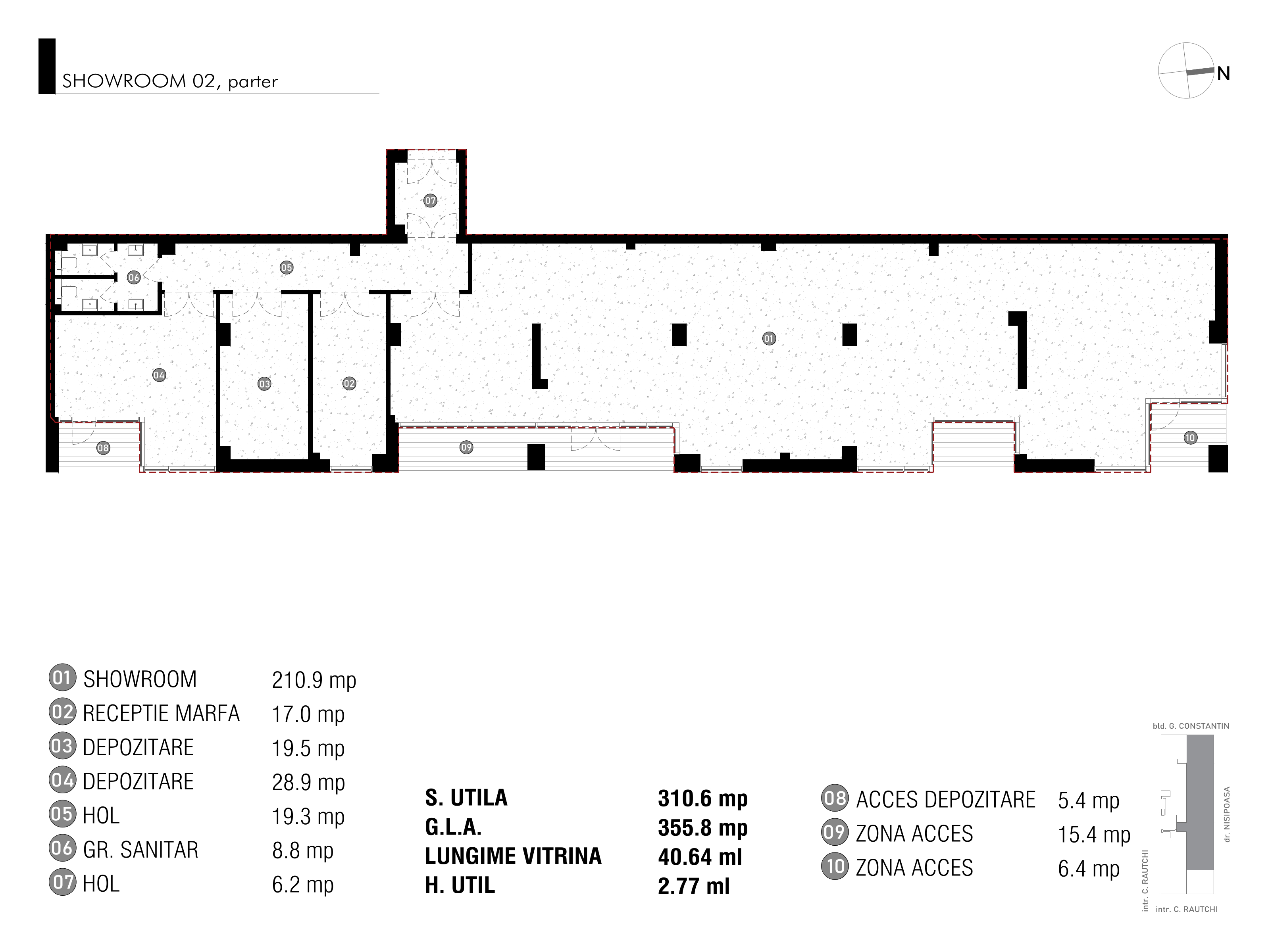 Compus din showroom 210,9 mp, camera receptie marfa 17 mp, camera depozitare 19,5 mp, camera depozitare 28,9 mp, hol 19,3 mp, 2 grupuri sanitare 8,8 mp, hol 6,2 mp, acces depozitare 5,4 mp, .