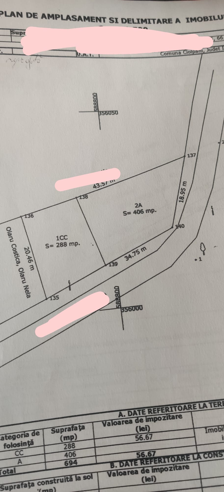 Ciolpani, sat Izvorani va prezentam spre vanzare un teren in Ciolpani sat Izvorani in suprafata de 700 metri pe strada Vintila Bratianu, are forma de trapez, deschidere stradala peste 50 metri, utilitatile sunt in fata portii (canalizare, gaz, curent), curtea are doua porti mari (poate intra camionul), gardul este pe fundatie din beton pe spalieri metalici, curtea este curata cu un singur nuc mare! Este la 2 km din DN1 si la aprox 500 m de Castel Film si- sau de COR.