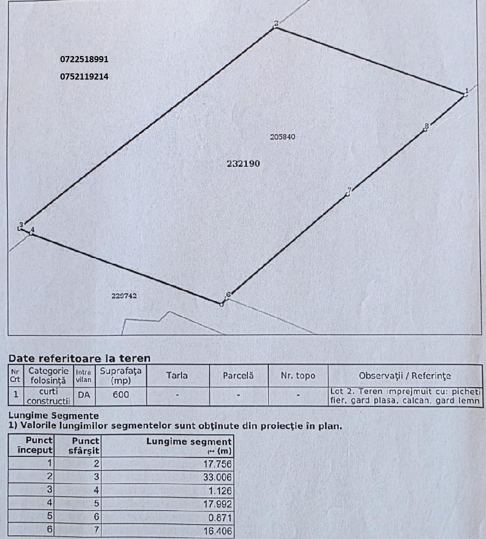Va propunem spre achizitie/ cumparare un teren cu potential - intravilan/curti constructii, avand o suprafata de 600 mp, cu deschidere generoasa la asfalt - 33 m, liber, imprejmuit, pretabil pentru constructia unui imobil rezidential - bloc, vila, duplex, clinica, gradinita, etc.