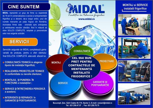 MIDAL proiecteaza, executa, asigura service si mentenanta preventiva in si post-garantie pentru instalatii complexe de frig industrial, de la camere frigorifice de mici dimensiuni pana la depozite logistice.Suntem un grup dedicat îmbunatatirii permanente a calitatii produselor si a serviciilor noastre,...